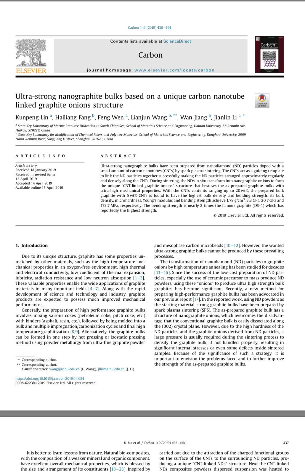 近日,谈球吧官方网站李建林教授、文峰教授科研团队在高性能石墨材料研究中取得重要进展。 这项工作的部分研究成果发表在碳结构材料的国际顶级期刊Carbon (Ultra-strong nanographite bulks based on a unique carbon nanotube linked graphite onions structure, 2019, 149, 436-444)。 在前期的研究工作基础上,研究人员通过仿生设计,在纳米金刚石粉体中引入少量碳纳米管,巧妙地解决了金刚石粉体转化制备石墨块体内部残余应力较大的难题。所制备的石墨块体为纯石墨相,其抗弯强度达到目前最强石墨材料的2倍,这一工作有望突破石墨材料的高精度加工的技术瓶颈。目前正在和有关单位合作,开发某些领域的专用石墨元器件。 2016级硕士研究生林坤鹏为论文第一作者。这项工作是与东华大学的相关课题组合作共同完成。(文/图:李建林)