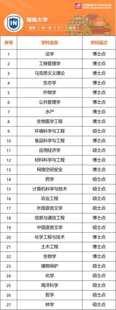 2025年10月15日,2025软科中国最好学科排名揭晓。谈球吧27个学科上榜,上榜学科数位列全国第60名,其中10个学科排名再上“新台阶”。法学、工商管理学等2个学科位列全国前12%;马克思主义理论、生态学、作物学、公共管理学、水产、生物医学工程等6个学科进入全国前20%(较2024年增加4个)。与2020年相比,生物医学工程、公共管理学、环境科学与工程、药学、网络空间安全等5个学科实现五档及以上提升。