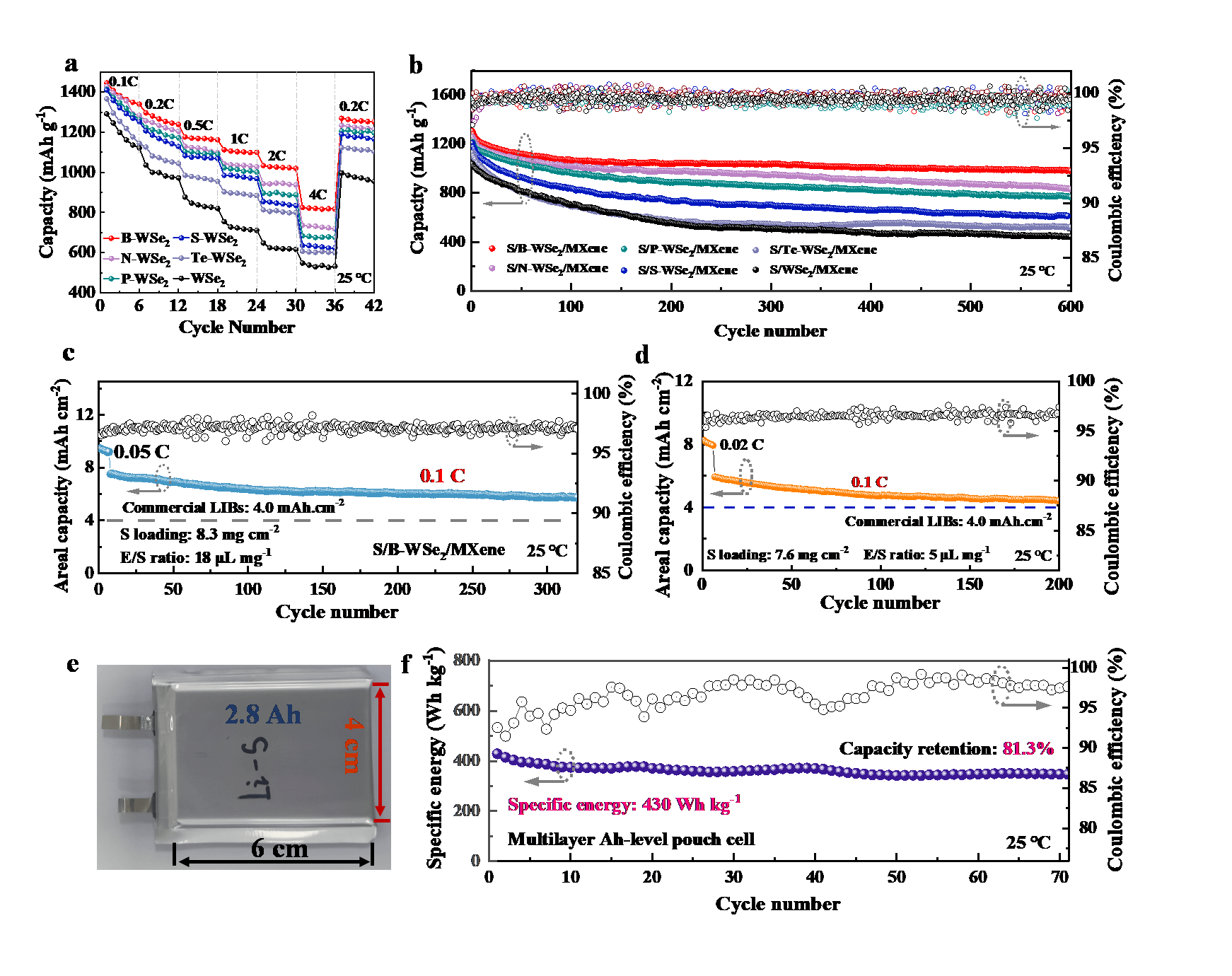 团队在锂硫电池关键催化机理研究领域取得重要突破,相关成果以 《Design rules for anion-doped catalysts revealed by p-p-s orbital coupling in Li-S chemistry》为题发表于国际顶级期刊《Nature Communications》。团队针对锂硫电池多硫化锂转化动力学缓慢、穿梭效应等核心问题,突破传统试错研发模式,结合机器学习、密度泛函理论计算与实验验证,首次从电子结构本质出发提出基于 p-p-s 轨道耦合的阴离子掺杂催化剂理性设计新准则,揭示了阴离子掺杂通过调控轨道电子耦合强度实现吸附与反应活性最优平衡的催化机理,还提出定量描述耦合强度的关键参数并建立相关映射关系验证了其普适性。基于该理论,团队成功构筑 B-WSe₂/MXene 高效催化材料,所制备的锂硫电池在高硫载量、贫电解液条件下表现出优异电化学性能,还实现了3Ah级安时软包锂硫电池的构筑,其能量密度超 430 Wh/kg,在器件尺度验证了设计准则的可行性与先进性。该成果为锂硫电池高效催化材料的理性设计提供了全新理论依据和技术路径,对推动高能量密度储能器件发展具有重要科学意义和应用价值,也为公司在海洋新能源材料和特种能源器件领域的持续创新奠定了坚实基础。
