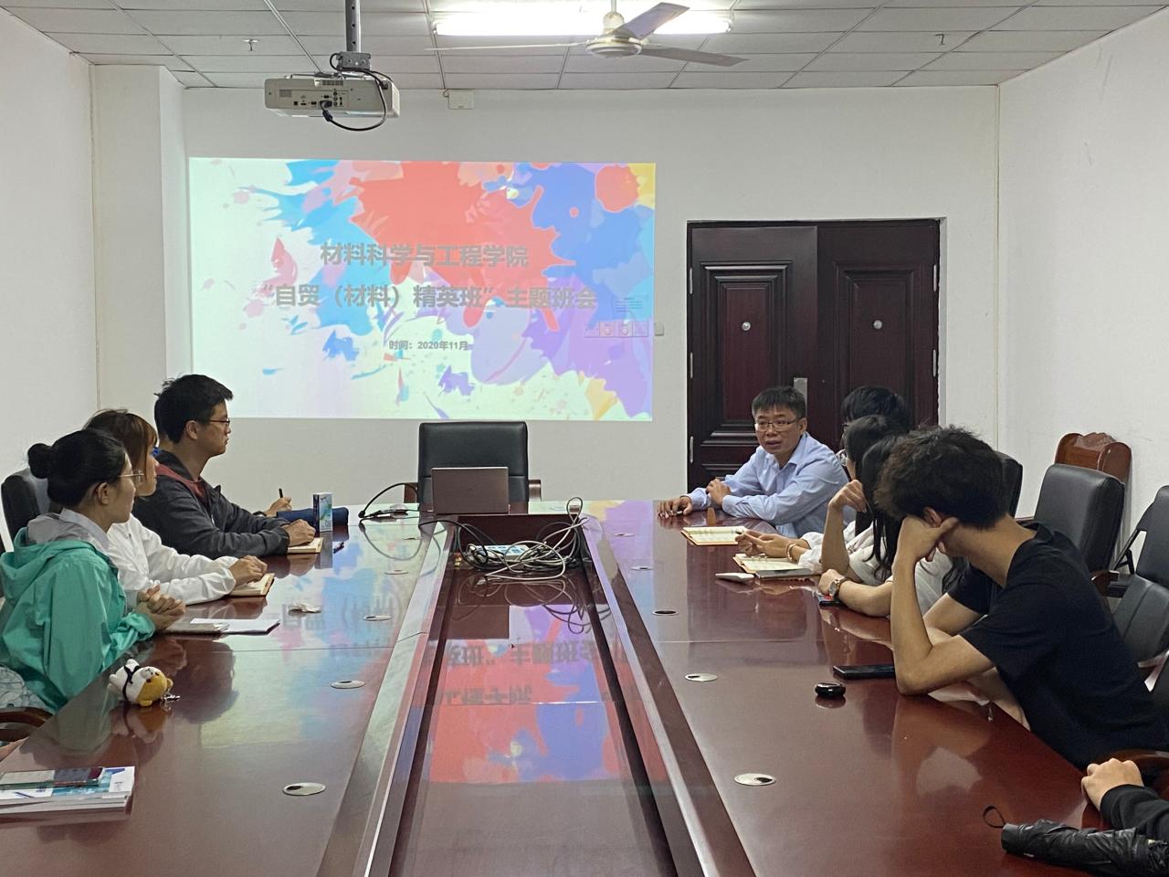 在主题班会上,学工办负责人详细说明了“自贸(材料)精英班”本学期的学习内容和班级活动。围绕员工关注的重点问题,学工办负责人郎老师一一进行了回答。在主题班会上,通过直接任命的方式,产生了“自贸(材料)精英班”的班委会,其中总负责人1名,学术科研负责人1名,创新创业负责人2名。