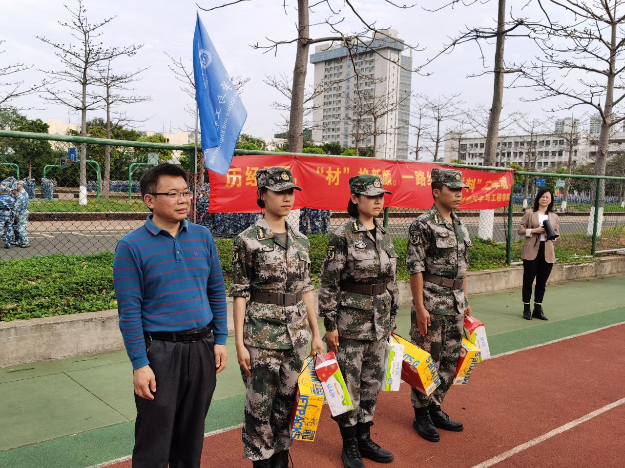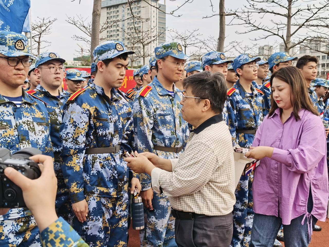 胡先文书记代表公司向军训教官送上慰问物资并表达了对十三中队教官的高度肯定和赞扬,希望三位教官在后续的军训中,高标准、严要求,训出水平、训出风采。