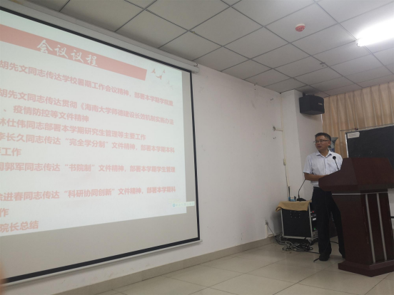 胡先文同志传达公司暑期工作会议精神,部署本学期公司重点工作。8月27日至29日,公司召开2021年暑期工作会议,会议主题是:高举习近平新时代中国特色社会主义思想伟大旗帜,解放思想、敢闯敢试、大胆创新,坚持高质量发展、全面提升办学水平,创建与海南自由贸易港发展相适应的一流大学。会议学习了公司党委符宣国书记的讲话、骆清铭董事长的主题报告,传达了完全学分制、书院制和协同创新中心等文件精神。