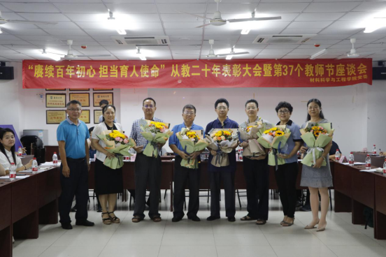 会议学习了谈球吧“十佳好老师”短片,对“从教二十年”教师进行表彰。员工代表为“从教二十年”教师代表献花,胡先文书记为教师代表颁发奖章。