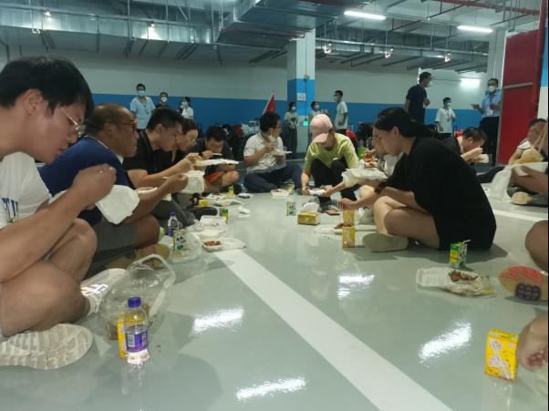 图二:支援陵水县抗击疫情青年志愿服务谈球吧志愿者工作后席地用餐,左一为虞培军。