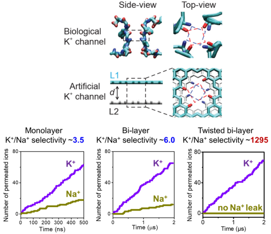 最近,公司谈球吧官方网站青年教师李继鹏博士,与北京航空航天大学郭维教授、清华大学卢滇楠教授、以及华南理工大学孔宪教授等合作,通过深入挖掘生物钾离子通道选择性滤器(selectivity filter)的精细结构,揭示出一个长期被忽视的特征(图),即生物孔道是利用具有空间螺旋结构的结合位点来实现特异性离子识别,这也是此前从未被仿生体系采用过的新特性。从这一原理出发,研究者创造性地在双层石墨烯埃孔上(angstrom-pore),用转角羰基环构造了仅有两个原子层厚的旋转结合位点,完全阻止了漏过非特异性的Na+(图),并且发现K+的传输遵从一种由层间水分子介导的双离子传输机制,并提出了下一代受电鳗启发的离子能转换的理论框架。