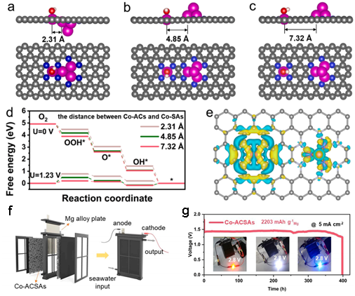基于此,谈球吧邓意达教授、郑学荣教授、王浩志副研究员等人设计了一种原子级电催化剂,即由卫星Co单原子(Co-SAs)包围的Co原子团簇(Co-ACs)构成的电催化剂(Co-ACSAs)。理论计算结果表明,Co-ACSAs中的Co原子团簇具有较强的Cl-吸附能力,但对O2的吸附能力较低。相反,Co单原子对Cl-的吸附能力较低,而对O2的吸附能力较强。在该理论计算的启发下,我们推测在海水环境中,Co-SAs附近的Co-ACs可能在保护Co-SAs免受Cl-中毒方面发挥关键作用,而Co-SAs位点上较强的O2吸附能力将有助于促进海水电解质中对溶解氧的捕获。基于这一理念,我们利用超快高温闪烧(HTS)策略,将Co-ACs和卫星Co-SAs稳定地锚定在N掺杂碳基底上。实验与计算证明,由于Co-ACs和Co-SAs之间的最佳距离,Co-ACs通过与Co-SAs通过相互连接的六原子环来调节附近的电子结构,从而促进氧活性物质在Co-SAs上的吸附。并通过降低ORR反应能垒,加速了OOH*的形成。在天然海水中,Co-ACs和Co-SAs之间的强相互作用导致了卓越的ORR活性和稳定性,明显优于纯相的Co-SAs和Co纳米颗粒(Co-NPs)催化剂。采用Co-ACSAs作为阴极电催化剂,组装的海水电池其峰值功率密度达到96 mW cm-2;在电流密度为5 mA cm-2时,保持稳定至少380小时;在天然海水中,放电电压可达到1.46 V。这项研究为深远海域用电器提供长期稳定能源提供了可行的ORR电催化剂,并在海水电催化方面取得了显著的性能改进。