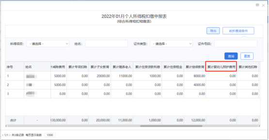 2.点击“个人扣缴明细查询”菜单,查看申报明细信息时,可查看该纳税人的“婴幼儿照护费用”扣除情况。