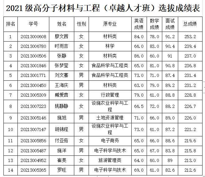 根据谈球吧《关于做好 2021 级普通本科特色班级选拔工作的通知》(海大教[2022]5号)和《关于开展 2021 级特色班级招生选拔二次志愿征集工作的通知》(海大教[2022]19号)文件精神,由员工本人自愿报名,经过英语、数学考试和面试等环节,在政治思想、身体状况满足条件的前提下,按英语+数学+面试的总成绩由高到低排序,择优录取14名同学,组建2021级高分子材料与工程卓越人才班。
