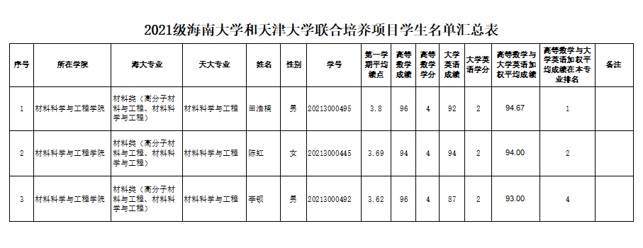根据《教育部办公厅关于做好对口支援高校联合培养本科生等有关工作的通知》(教高厅[2010]1号)、《谈球吧与天津大学联合培养本科生工作方案》和谈球吧教务处《关于选派2021级员工参加谈球吧和天津大学联合培养工作的通知》(海大教[2022]18号)的文件精神和要求,员工在符合基本条件基础上,以“高等数学”和“大学英语”课程成绩的加权平均分由高至低确定获得联合培养资格的员工名单。