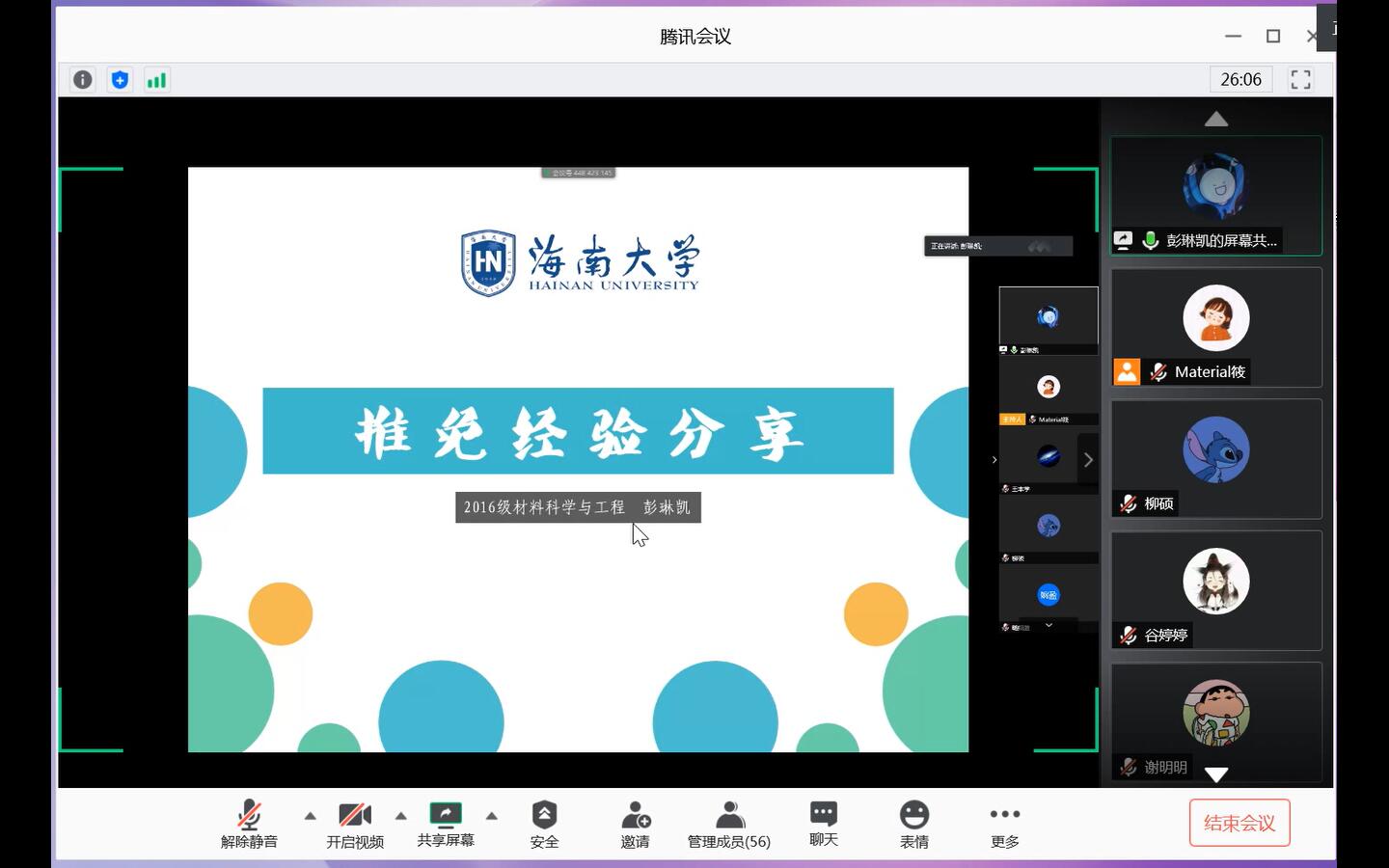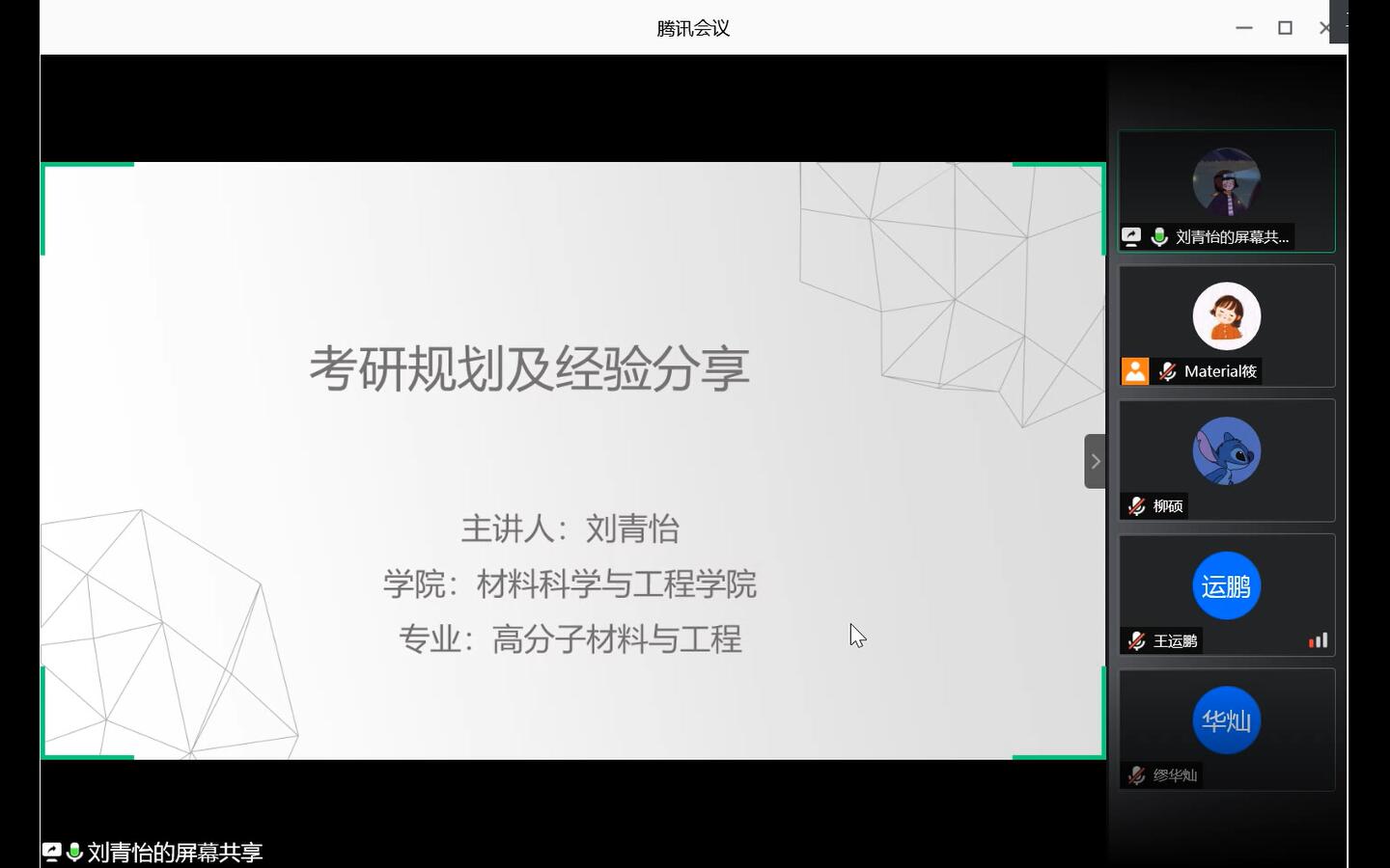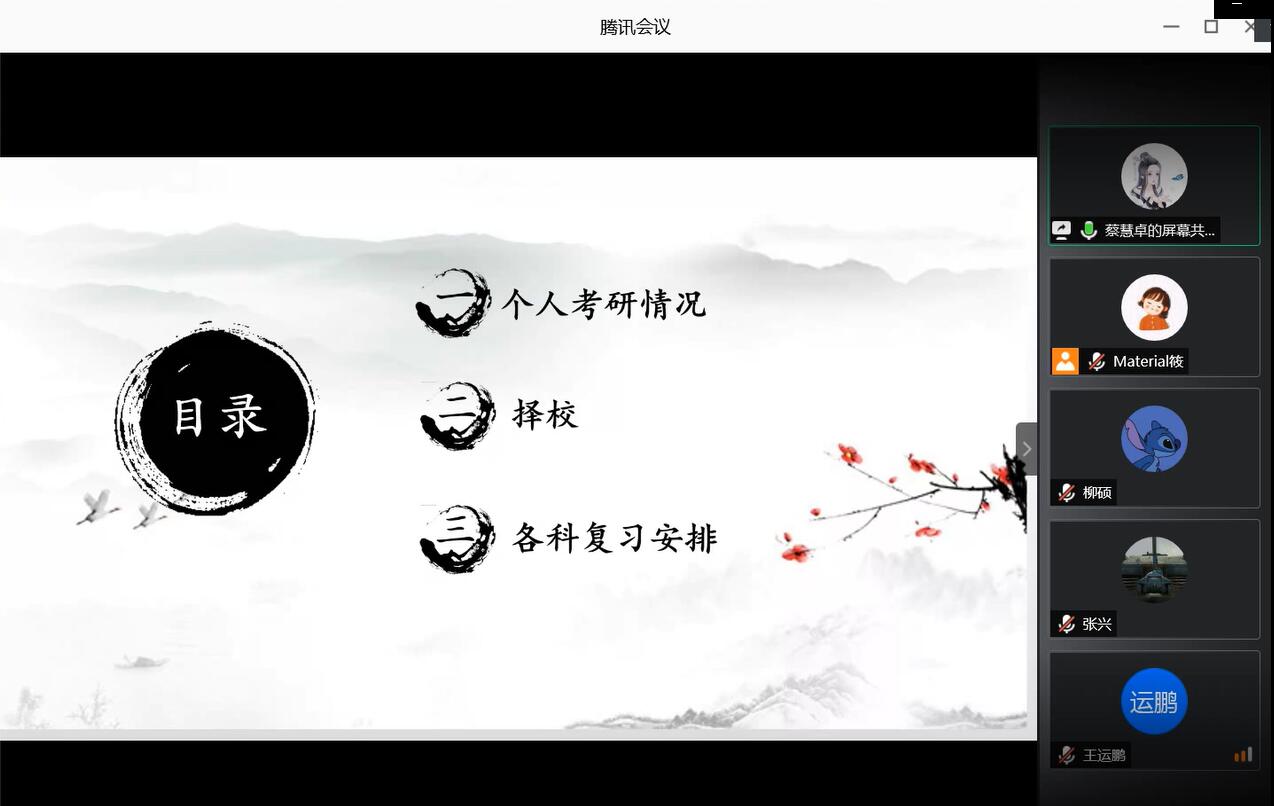 为分享当前考研最新动态,对立志于考研的同学进行指导,使公司2017级本科生对考研过程有更具体、更清晰的认识, 6月20日19点30分,通过腾讯会议线上直播的形式成功举办以“研途修筑梦想,经验拨开迷茫”为主题的线上考研经验分享交流会。2017级本科生辅导员郎筱宇老师出席本次交流会。