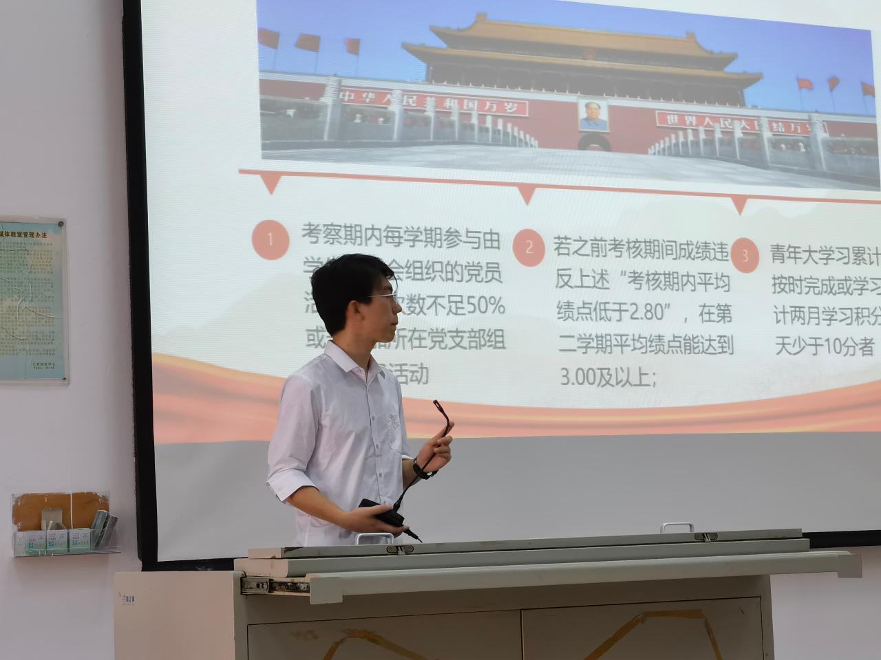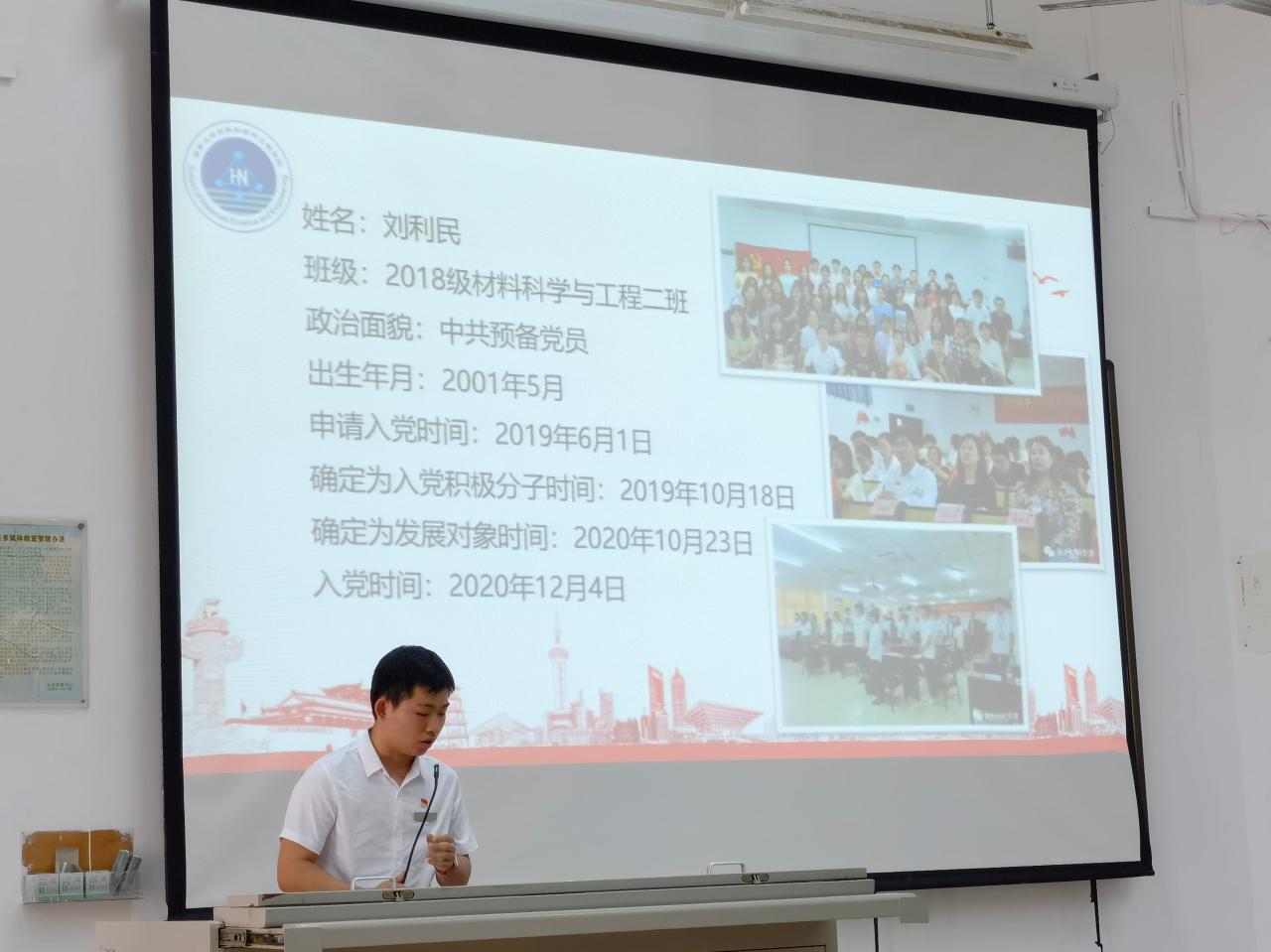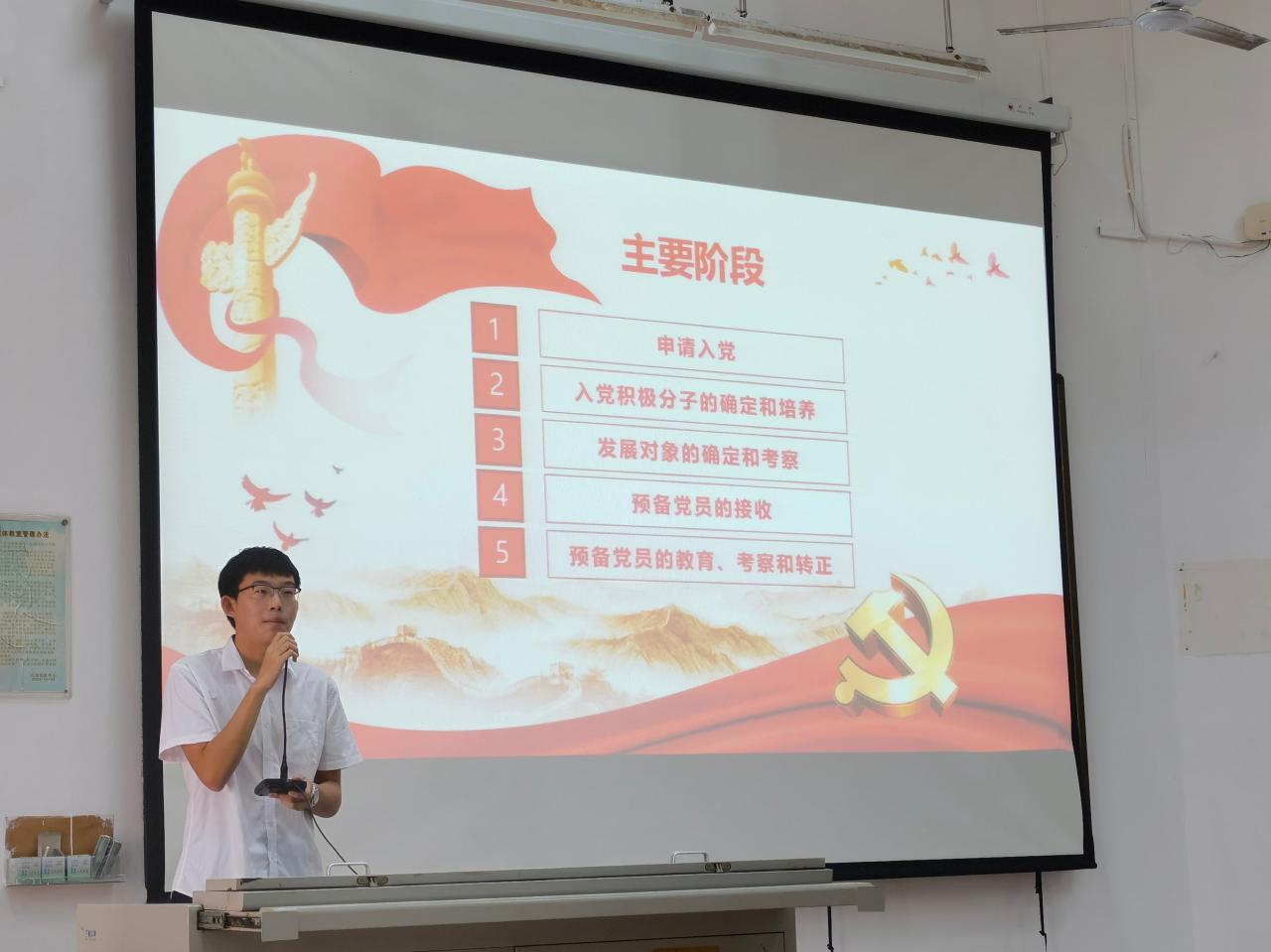 党建副书记漆红斌向大家讲解入党推优考核方案以及确定为发展对象考核方案。党训部部长张玉生对加入中国共产党的程序作了认真讲解。优秀党员代表刘利民学长紧扣“不忘初心,砥砺前行”主题,向新生讲述中国共产党从无到有的艰苦奋斗历程。