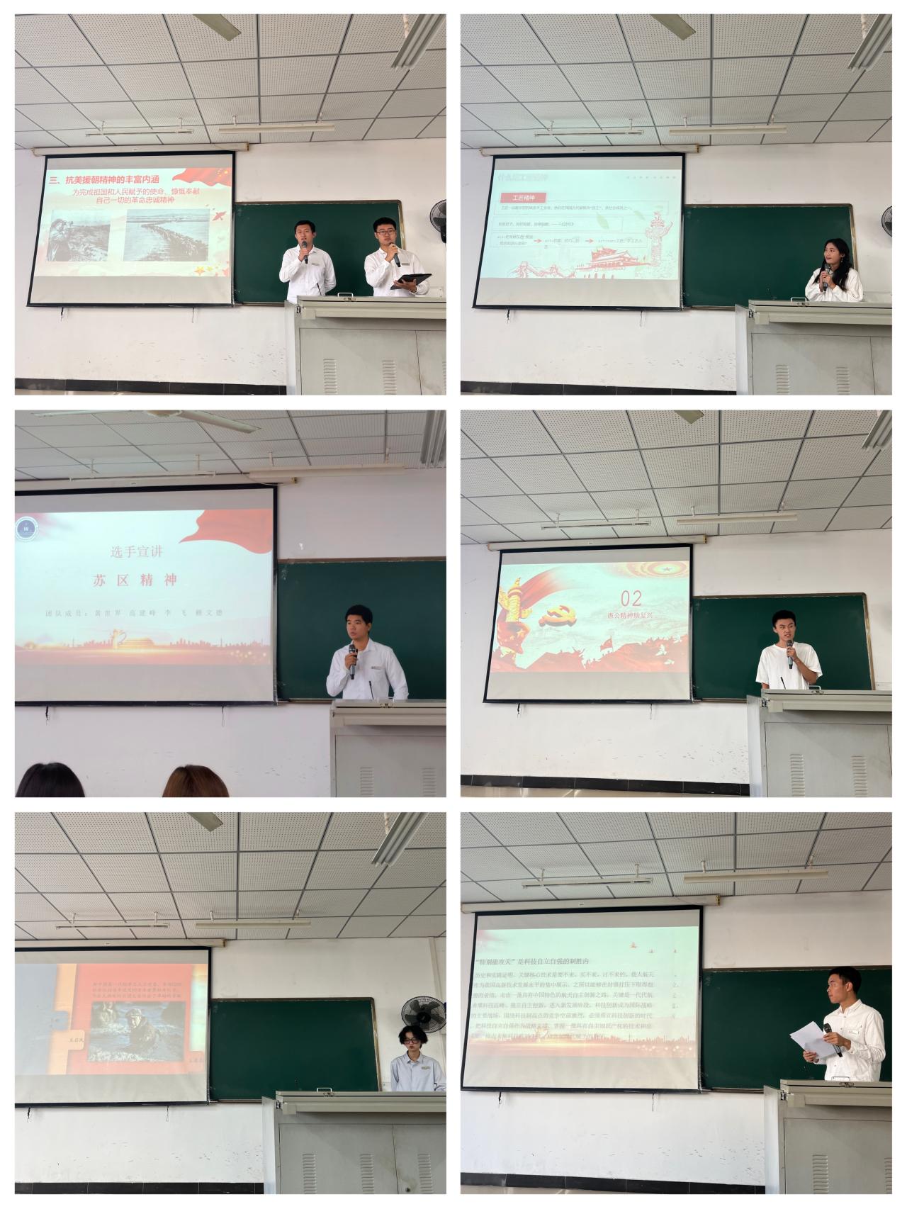 本次大赛分为选手宣讲、评委点评、现场颁奖三个环节。大赛首先由初赛线上评审选出的前六组选手依次进行宣讲,选手们紧扣主 “两载人航天精神”“铁人精神”“抗美援朝精神”等中国共产党革命精神的主题,通过各位选手的真挚解读,带领观众领略百年党史,体会红色精神。最后,在三位评委的精彩点评中,工作人员统分后宣布获奖结果,三位评委分别为宣讲选手进行颁奖。祝贺袁之城为代表的第三小组、孙冠军为代表的第一小组、赖文德为代表的第四小组荣获三等奖;钱子萱为代表的第二小组、陈科举、吴余凡为代表的第五小组荣获二等奖;谭雨津为代表的第六小组荣获一等奖。