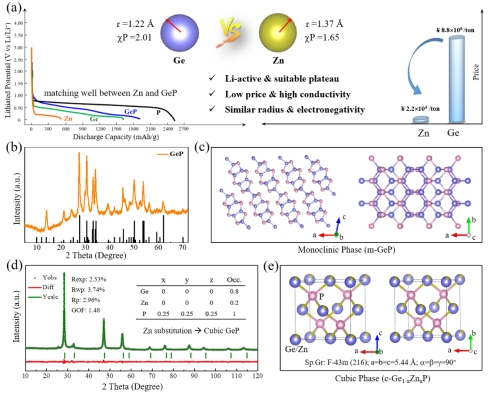 图1. (a)Zn与Ge的原子半径、电负性、电位平台及原料价格比较;单斜相GeP(b-c)和立方相Ge1−xZnxP(d-e)的XRD图谱及晶体结构图。