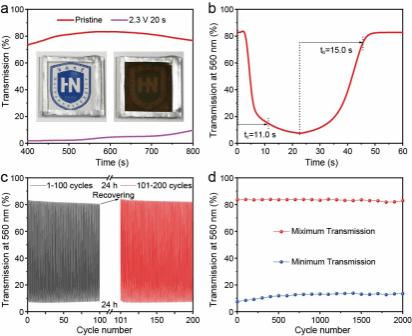 图1 基于碘单质可逆电沉积的电致变色器件性能展示