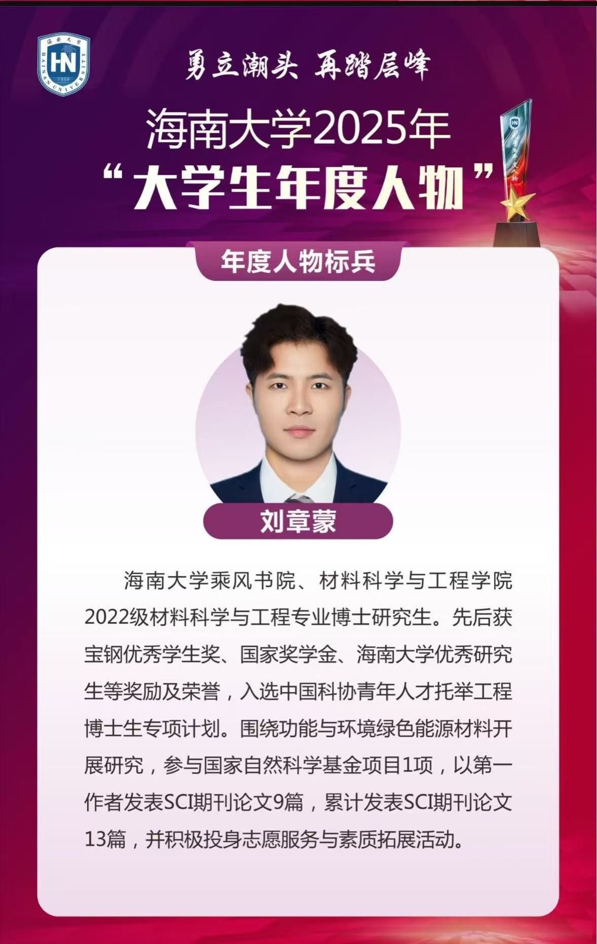刘章蒙,谈球吧2025年老员工年度人物标兵,谈球吧官方网站2022级材料科学与工程专业博士研究生,2025年入职海南医科大学。他曾获宝钢优秀员工奖、国家奖学金、谈球吧优秀研究生等重量级荣誉;作为“中国科协青年人才托举工程博士生专项计划”首批入选者,获中国青年科技工作者协会托举支持;更包揽“校研究生优秀毕业生”“校研究生年度人物标兵”等称号,用一项项殊荣铺就能力进阶的坚实阶梯。